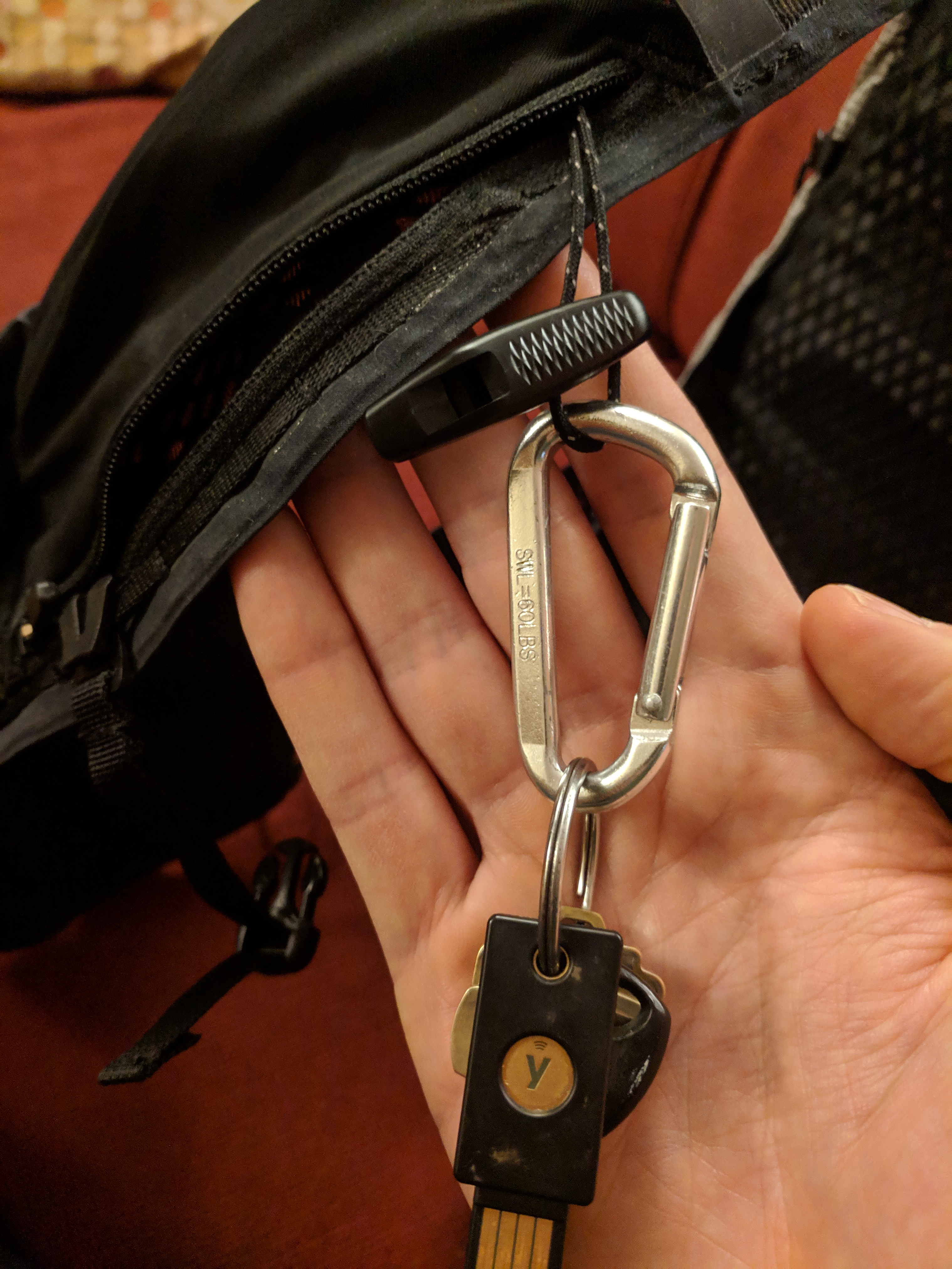 I put a minimal Corkor wallet right in the same pocket. This way I’m prepared for the dystopian future of needing to stop and pay to use privatized toilet in the future. Just kidding. Hopefully not. Having my wallet and keys up front reduces wallet-and-key anxiety. After a hurried launch in the morning or a tired exit in the evening, I may find I haven’t been mindful about stuffing all my gear in the pack. Did I pack the wallet? Did I pack the keys? With those babies are up front nestled in my bosom, I can just give them a quick pat to know that they are safely on board without breaking stride.